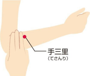 (3)手三里…肘を軽く曲げて出来るシワから指3本分手首側におりたところ。