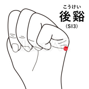 (2)後谿(こうけい)…手を軽く握って、小指側に出来るシワの端っこ。